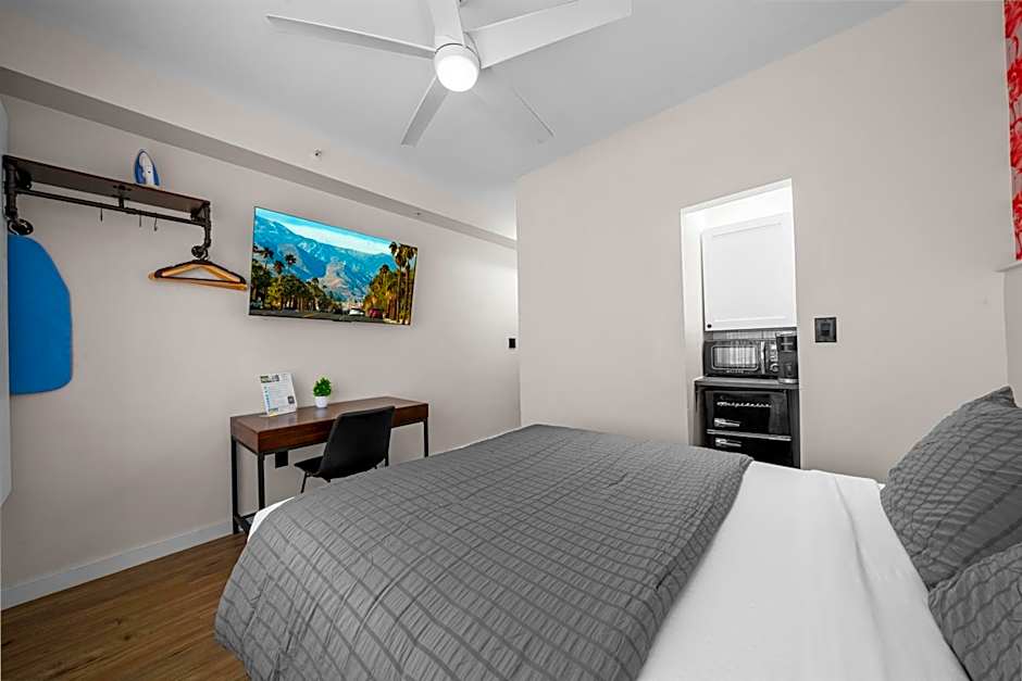 This guestroom features a flat-screen TV and a small refrigerator.